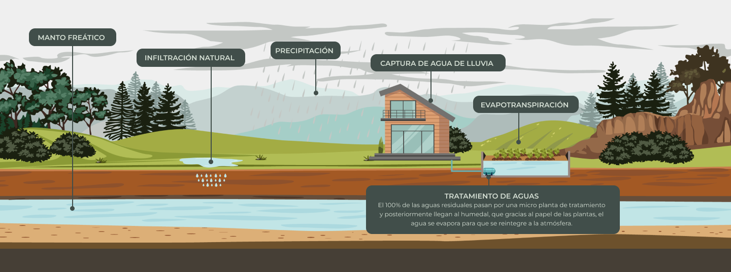 La totalidad de las aguas residuales se convierten en agua limpia mediante un sistema de tratamiento y humedales. Estos, aprovechando las propiedades naturales de las plantas, re-incorporan el agua al ciclo natural de evaporación, condensación y precipitación.